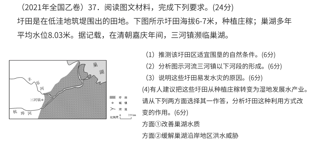 解析:农业发展的自然条件包括气候、地形、土壤、水源等,圩田是在低洼地筑堤围出的田地,所以首先与地形关系较大,需要有低洼的地势,用于种植庄稼,所以与气候、土壤、水源等条件有关。该地位于长江中下游的巢湖地区,属于湖区,地势低洼,湖底有较厚的沉积物,土壤肥沃,同时位于亚热带,热量充足,靠近湖泊,用水方便。